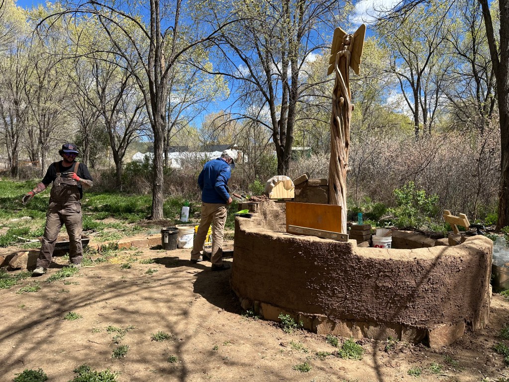 As I was saying, I’m taking two classes, and yesterday, we were working on an adobe grief sculpture, designed by my teacher Mark Goldman, and sponsored by Red Willow Hospice. (The Lor Foundation funded the installation in Baca Park, here in Taos.)
