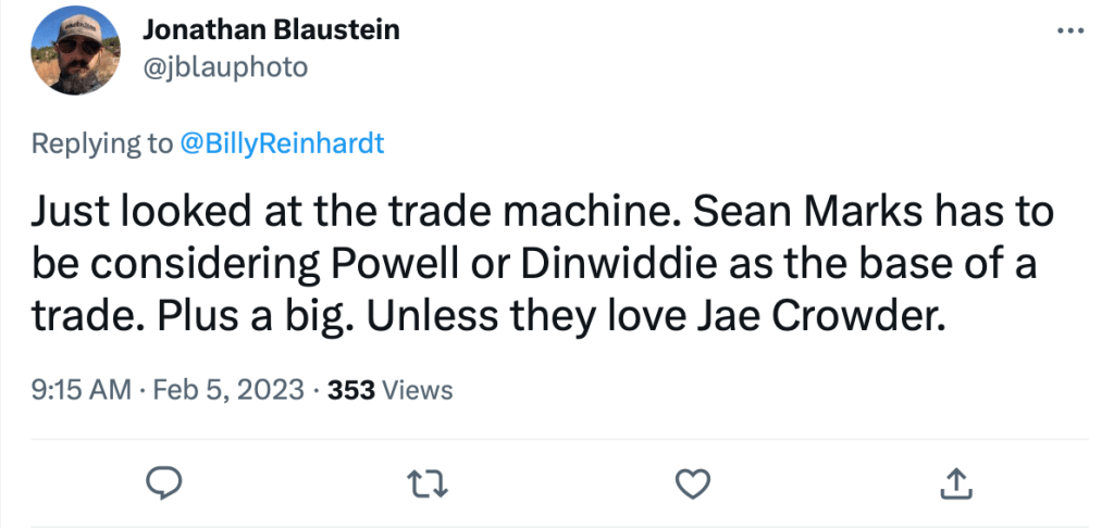 By Sunday, I had it dialed up in the trade machine, and tweeted that Dinwiddie had to be the/a prime target.