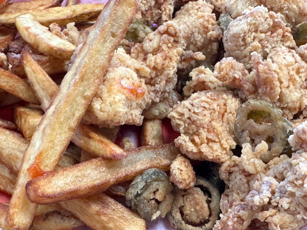 The nice waitress confirmed it meant fried jalapeño slices, along with the chicken and fries.