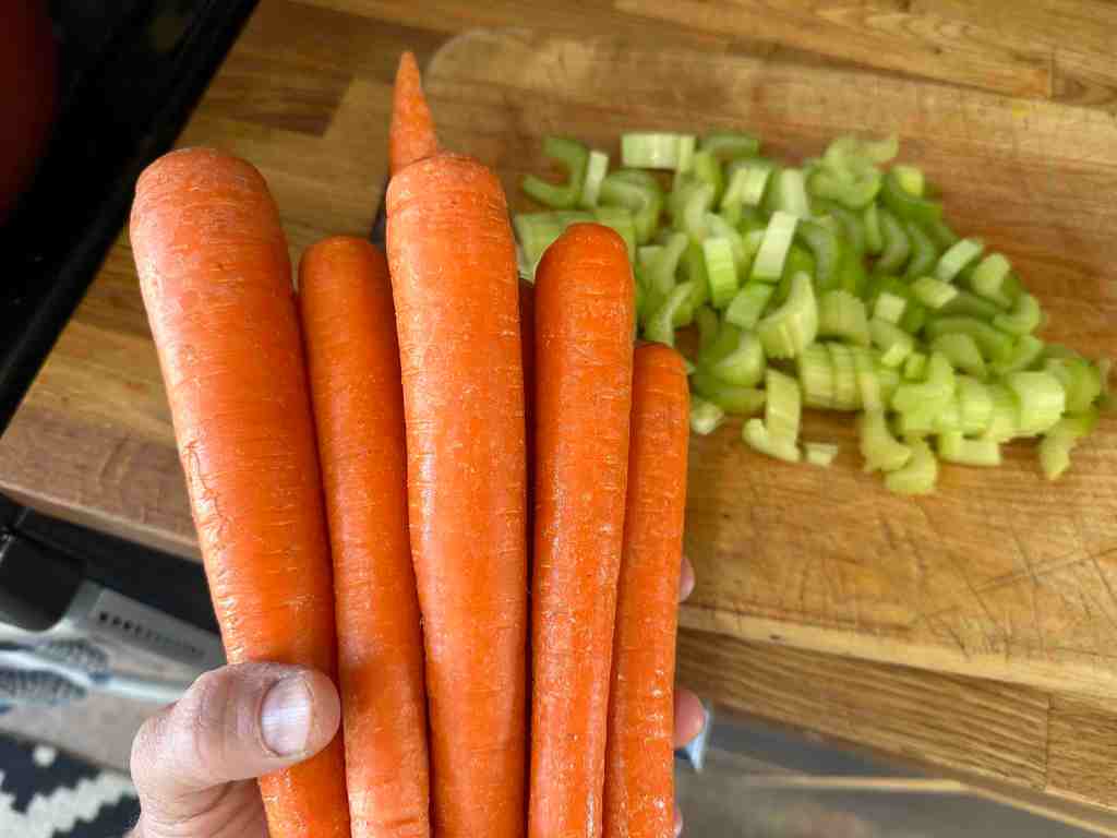Then you wash, chop and add four celery stalks, (or more, if you prefer,) and about 8 big carrots.