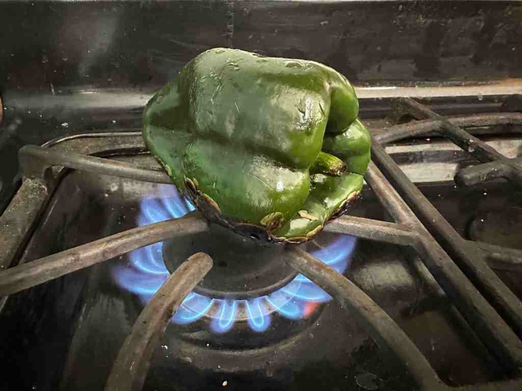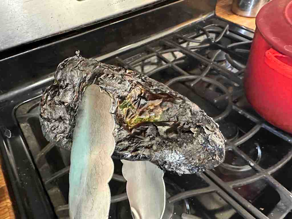 Before or after, fire up a poblano pepper on the gas stove, char it, then put it in Tupperware for five minutes, and slide off skin in the sink. Finish cleaning the pepper, chop it, and add to the soup.