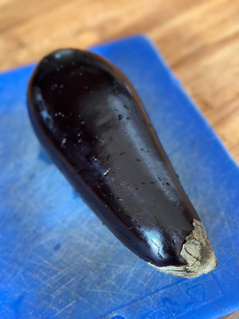 Wash and thinly slice one eggplant. Lightly salt and pepper the slices, then set aside. Once they sweat, (release moisture,) lightly pat down with a paper towel.