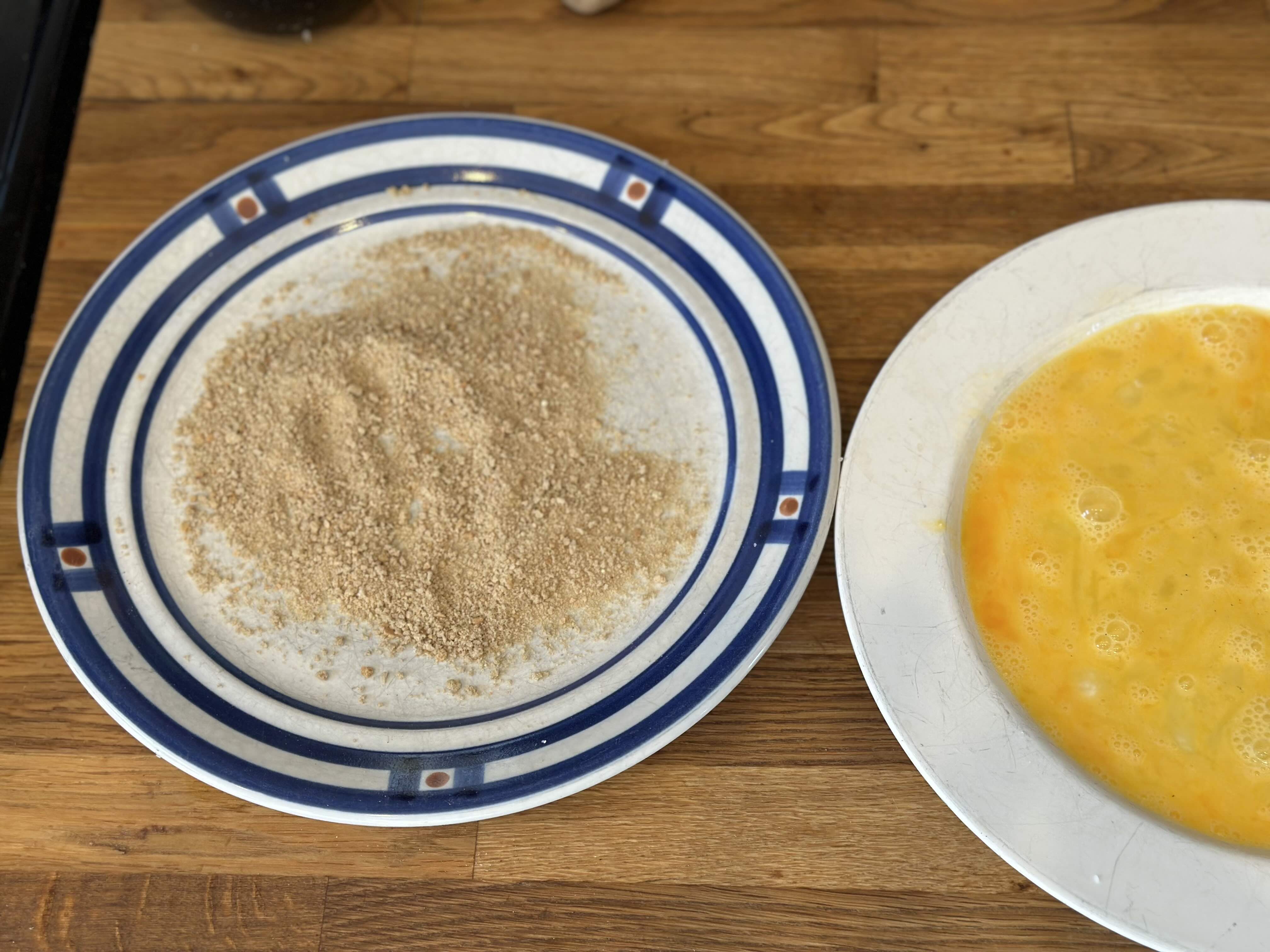 First, pat it fully in flour, then coat in egg, then pat in the bread crumbs, before depositing in the hot oil skillet.