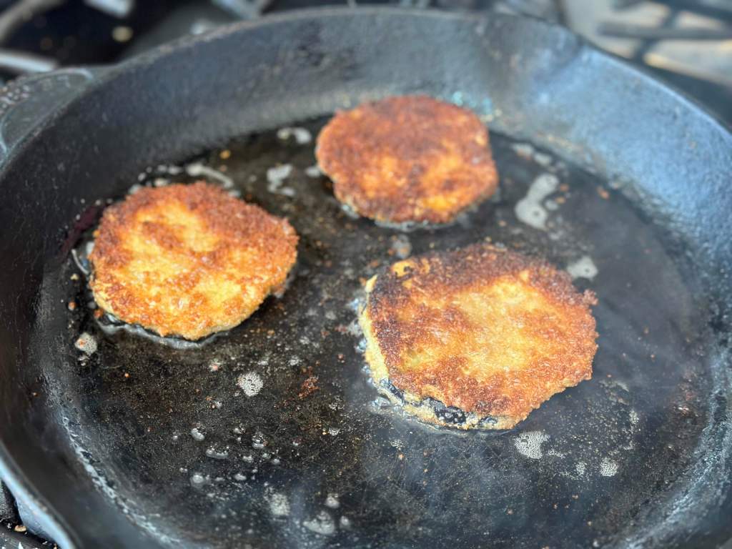 Flip each slice when it’s nice and brown, and then remove onto cutting boards or plates covered with paper towels. (To absorb the oil.)
