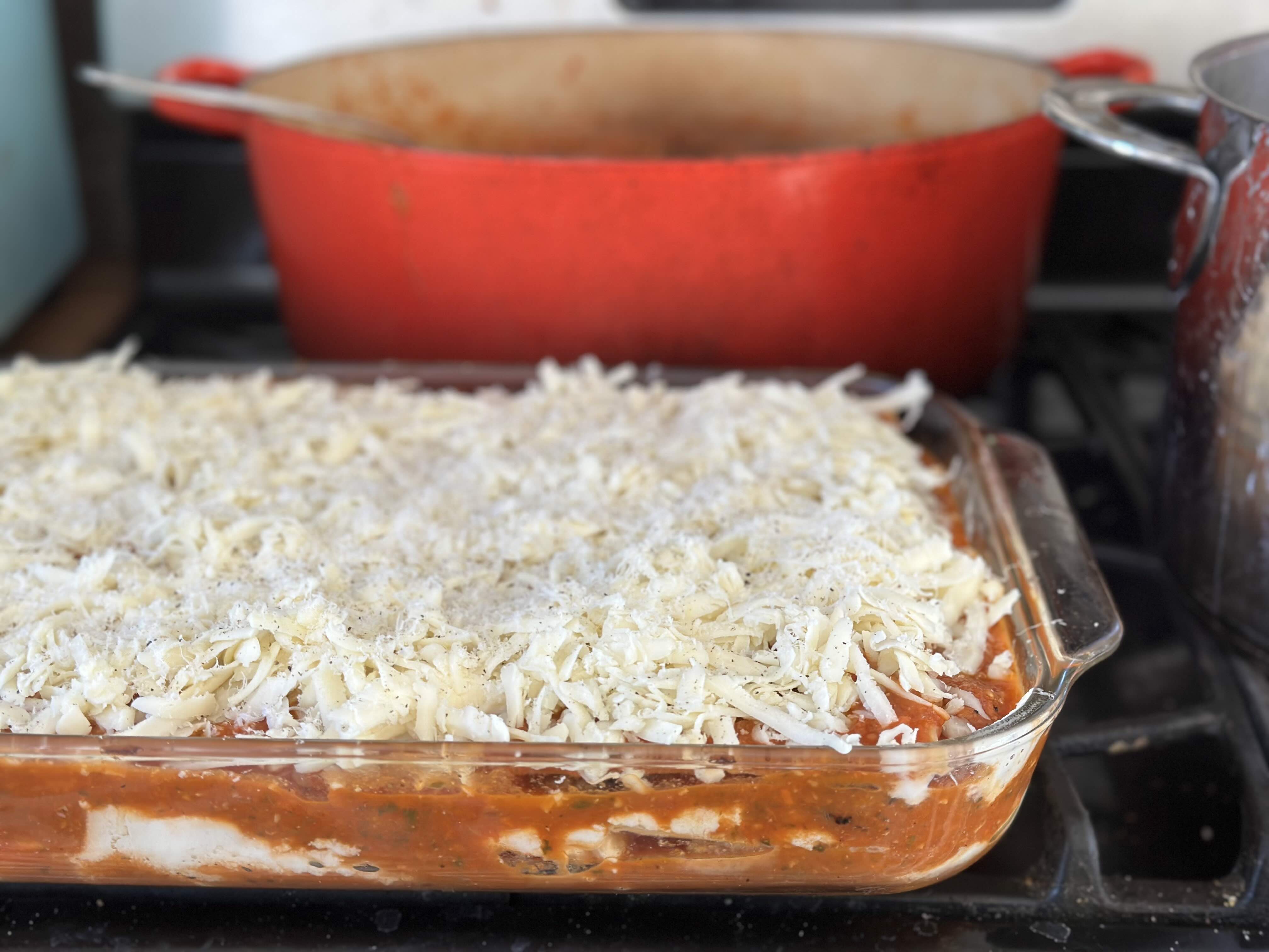 Then another layer of noodles, a thick layer of sauce, and then the grated mozzarella.