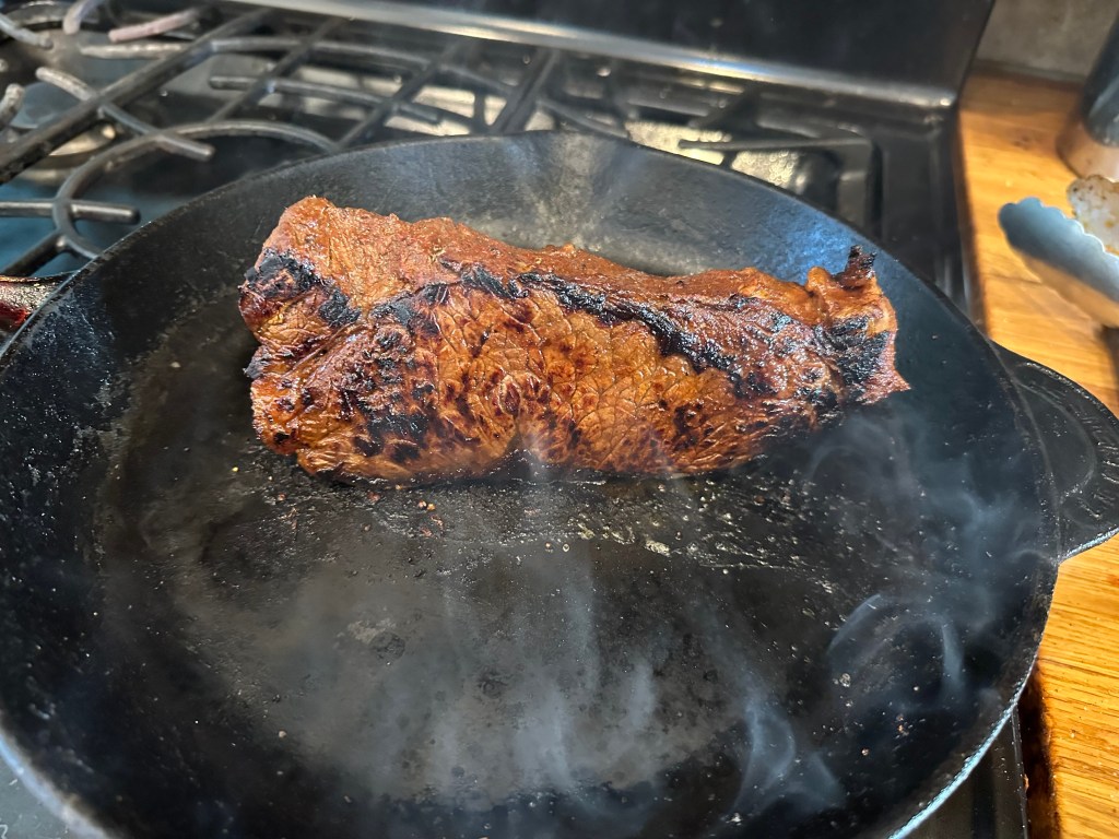 Give the skillet a minute to heat up well again, then cook the meat on front and then back, without moving it, until each side has some nice crunch and color.