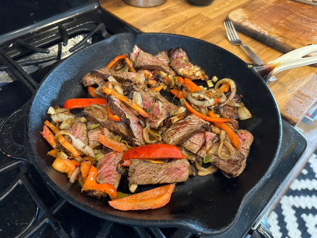 The meat will be undercooked, so carefully slice it, then add the steak, peppers and onions back to the skillet.