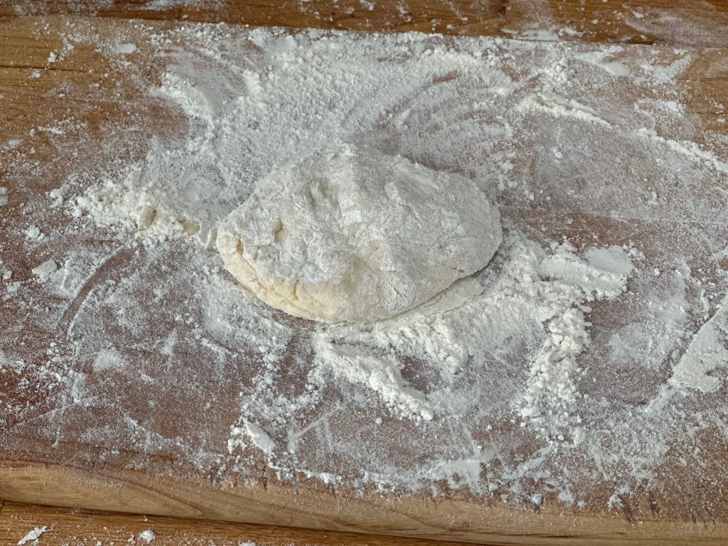 After proofing, lightly knead the dough out on your cutting board, with a bit more flour, and then cut into equal sized pieces, which you roll into a balls.