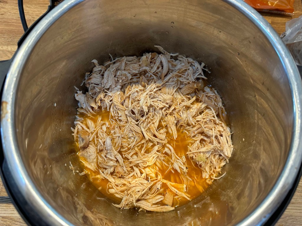 Fill one tortilla with chicken and a scoop of mango jam, roll it, and place it in the pan.