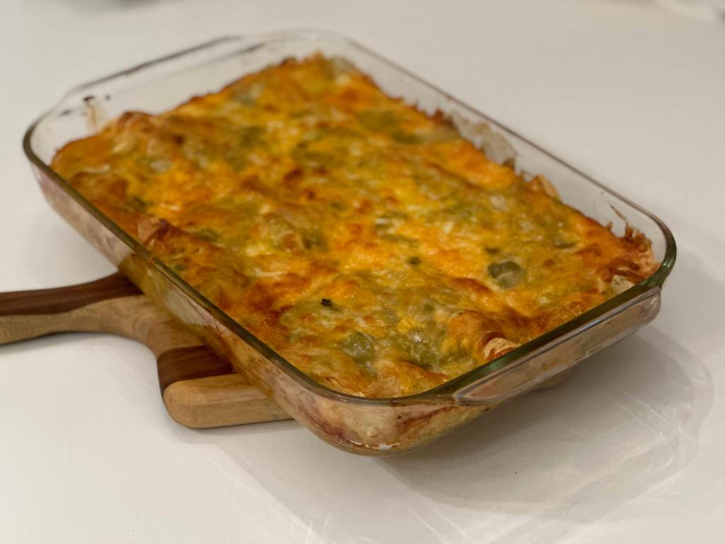 To assemble the enchiladas, (before baking,) coat the bottom of your casserole pan with a layer of chile sauce.